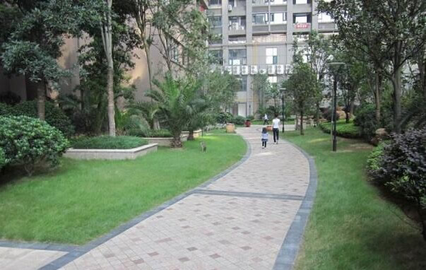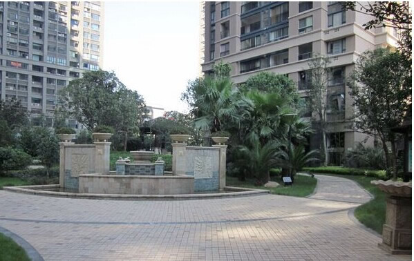 小区内部围合形成一个12000左右的中央绿地,布置水景、小品、绿化,供小区业主休憩,运动之用。所有住宅楼均架空5.5左右,架空层也布置绿化景观,与中央绿地一起,形成一个大的绿化系统。景观设计以“水、木、石”为其环境的基础元素,设计师以通过不同的展现形式,对这三大元素进行了多种变化。以象征性元素(如卵石、沙地等)与水的巧妙搭接,营造别具特色的水世界;由木质材料和拟木构筑的完美结合强化了社区的自然风格;砂岩、石雕等自然体构筑物的大量运用,整个园林彰现出浓厚的现代东南亚风情,营造出简洁、现代休闲生活空间。